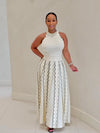 Modern minimalism meets sleek sophistication in this cream skirt set, elevated by bold black trimming that adds a clean, defined edge. The sleeveless top and high-waisted skirt create a perfectly polished silhouette, crafted from a stretchy, figure-hugging fabric that offers both comfort and contouring.