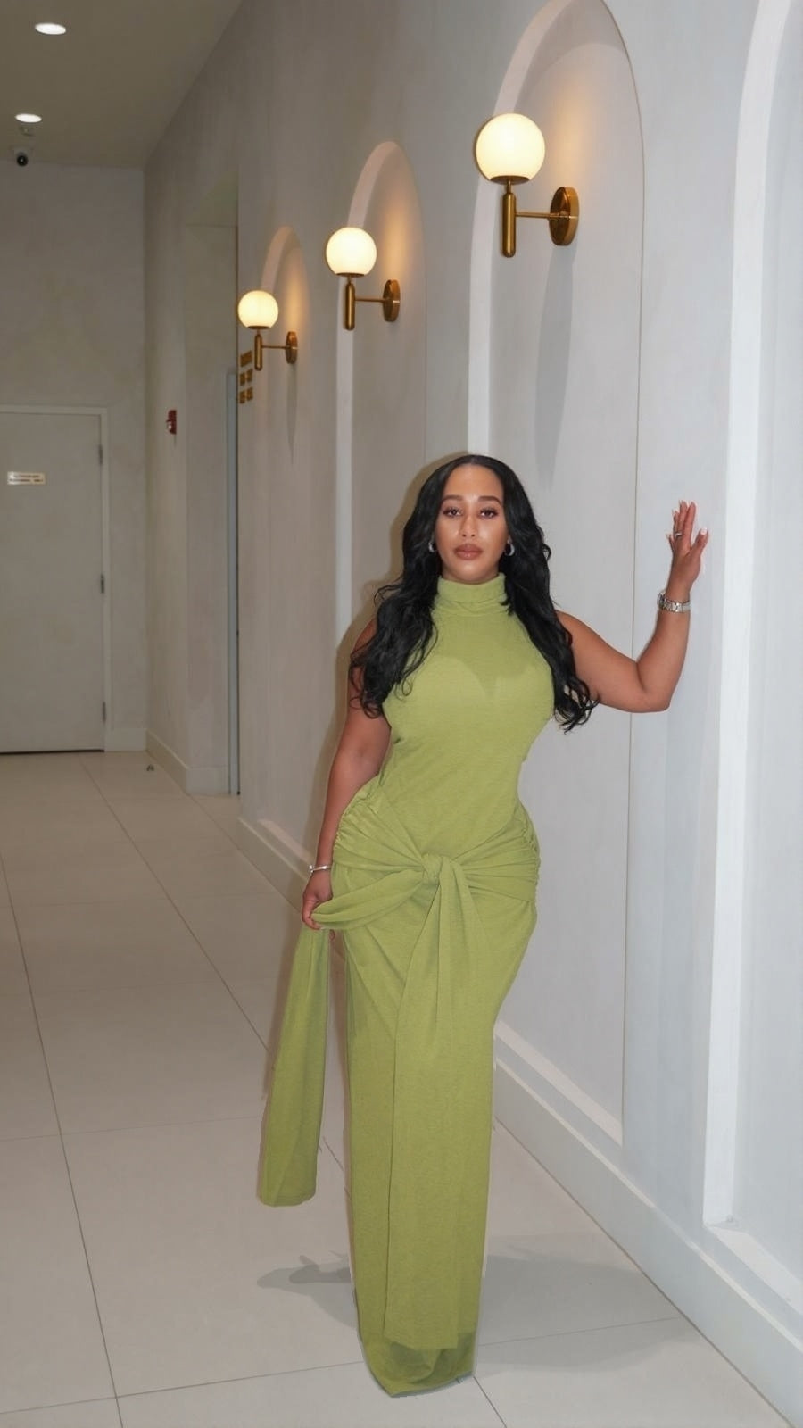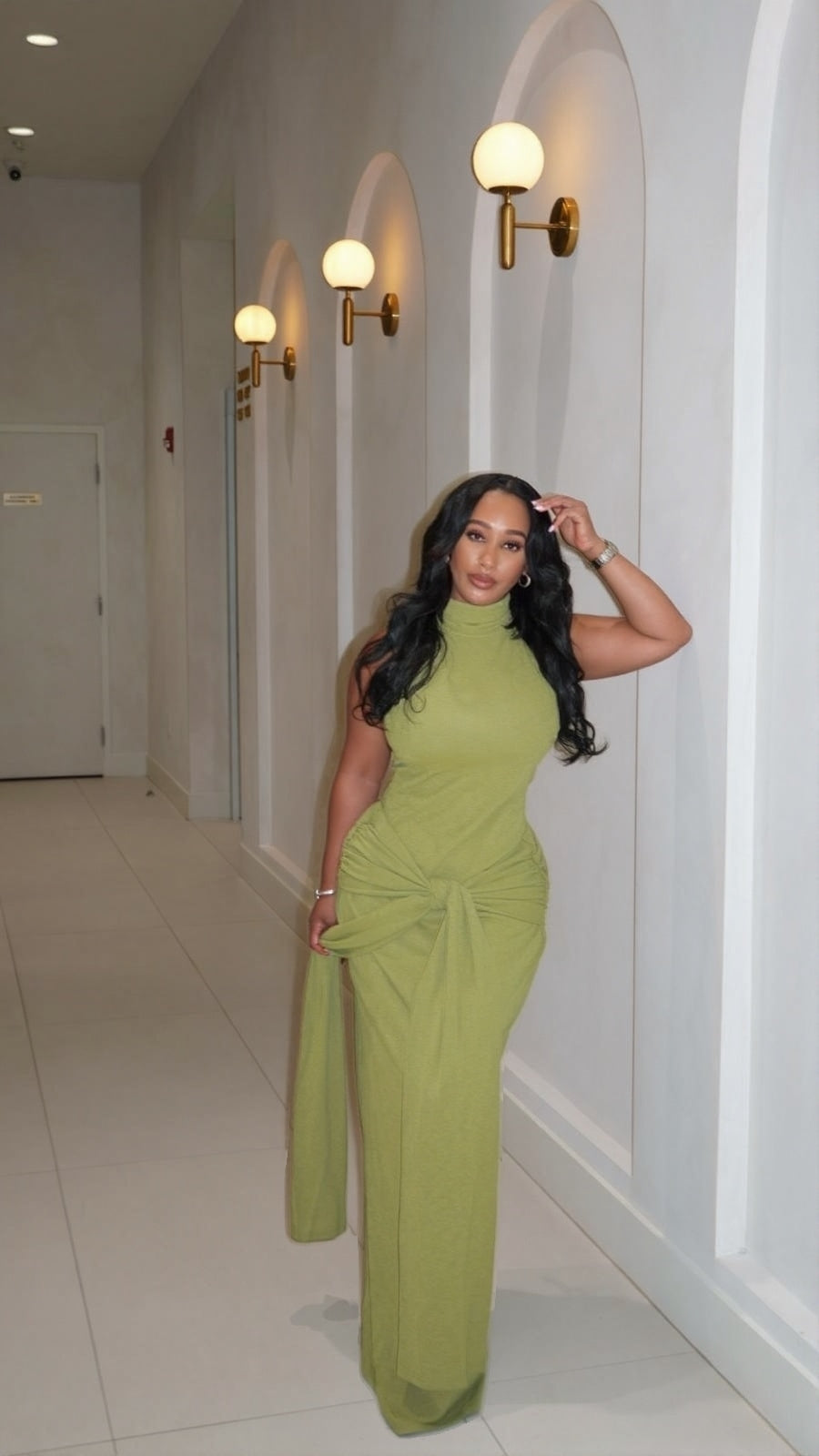 Turn heads in our Luxe Olive Green Beauty, designed for women who want a sophisticated, body-flattering evening look. This elegant formal dress features a high neckline, waist-defining ruching, and a dramatic side drape that adds movement and polish. Made from a soft stretch fabric, this gown offers all-night comfort without compromising style.